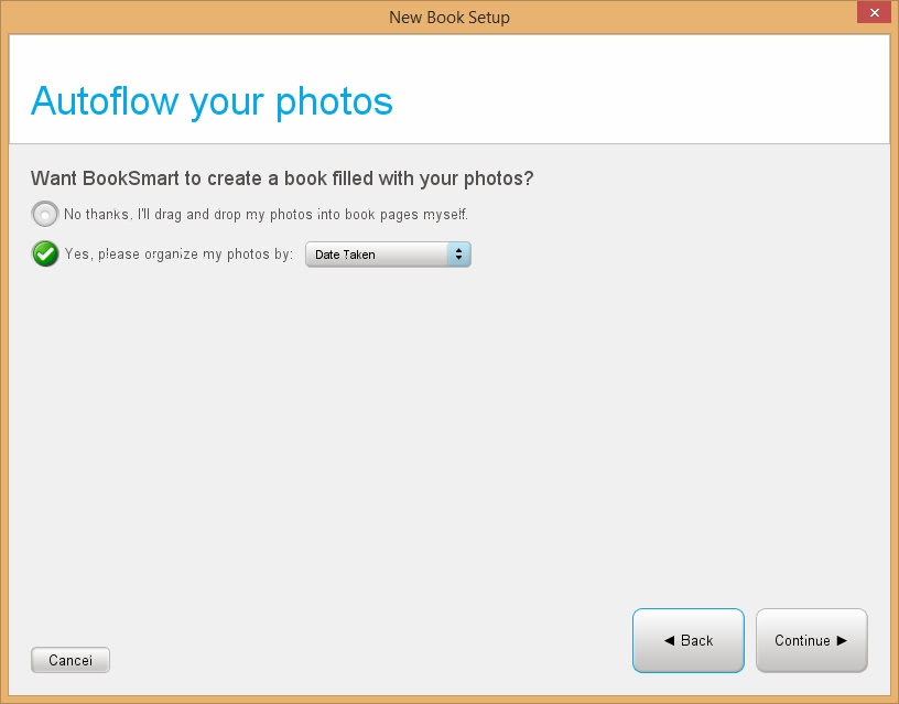 The screen after that is another choice, dependent on how much control you want over your book. The simple option is to click "Yes, please organize my photos by Date Taken." This will zap all your photos - from January to December - into your pre-designed book. But, if you want to take a more creative approach - perhaps changing a few of the layouts and the book order, you might want to click "No thanks, I'll drag and drop my photos into book pages myself."
