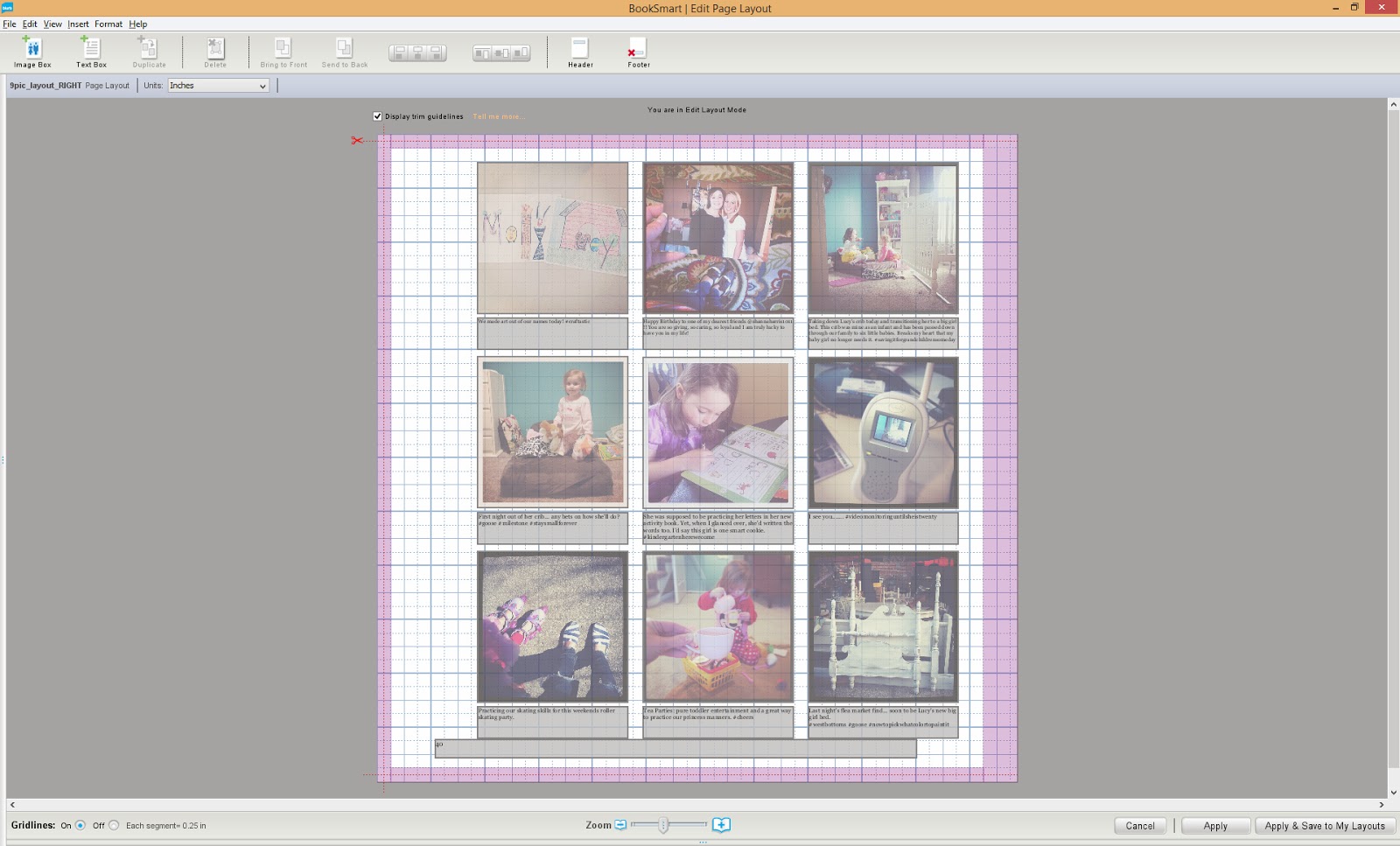 On the next screen, you'll be able to move, shift, re-size, etc. each of your image and text boxes. I started with the Yearbook layout and then adjusted each of the boxes to be square, so that it would fit my square-formatted Instagram pics. Once you're done editing the layout, be sure to click "Apply & Save to My Layouts" and name that specific layout. It makes things easier later on.