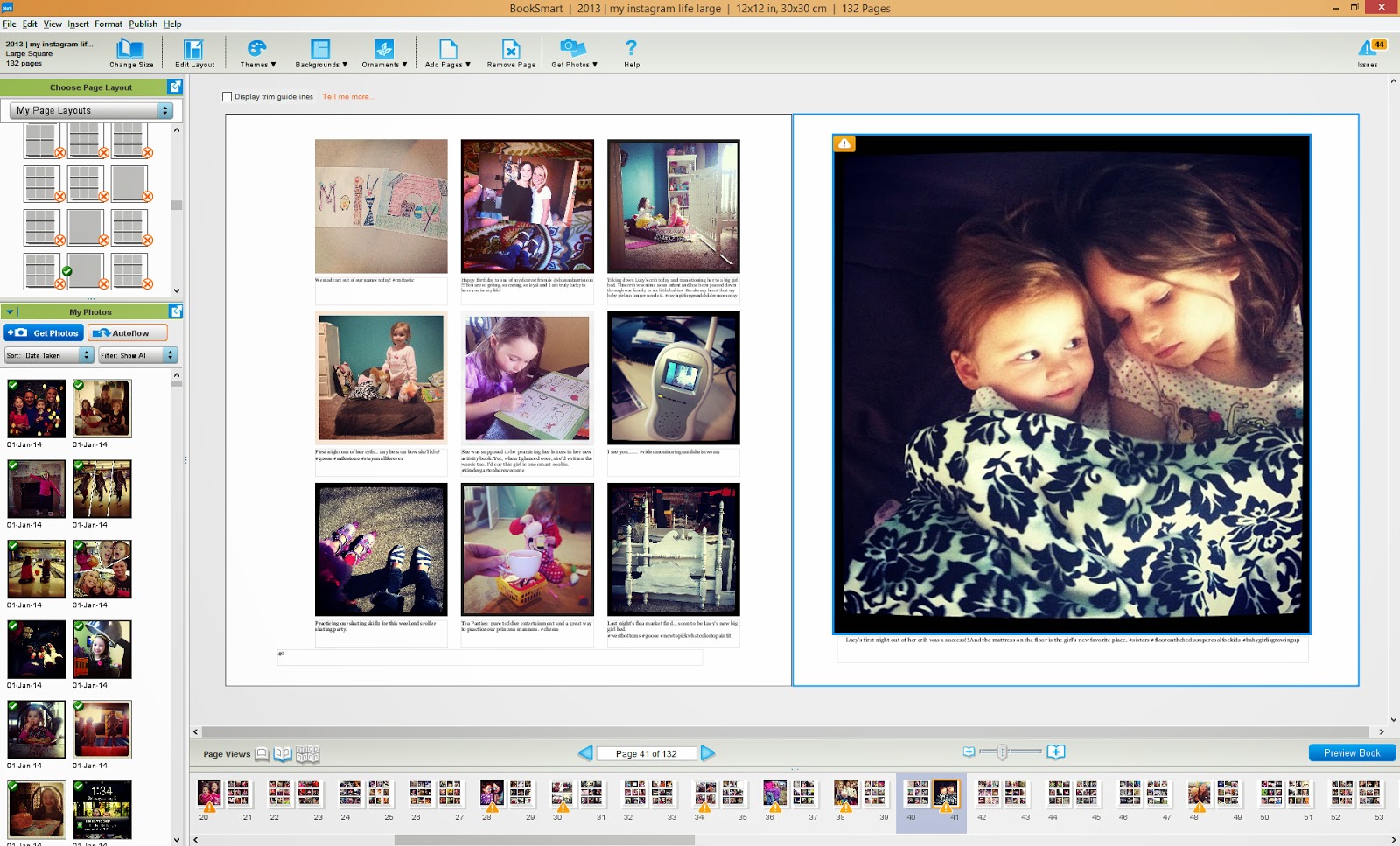 Because I like simplicity, I kept all my layouts very similar. Just a square image box with a caption box underneath. And as I changed them from the original pre-made layouts, I saved my new custom ones into "My Page Layouts" so I could use them later-on in the book.