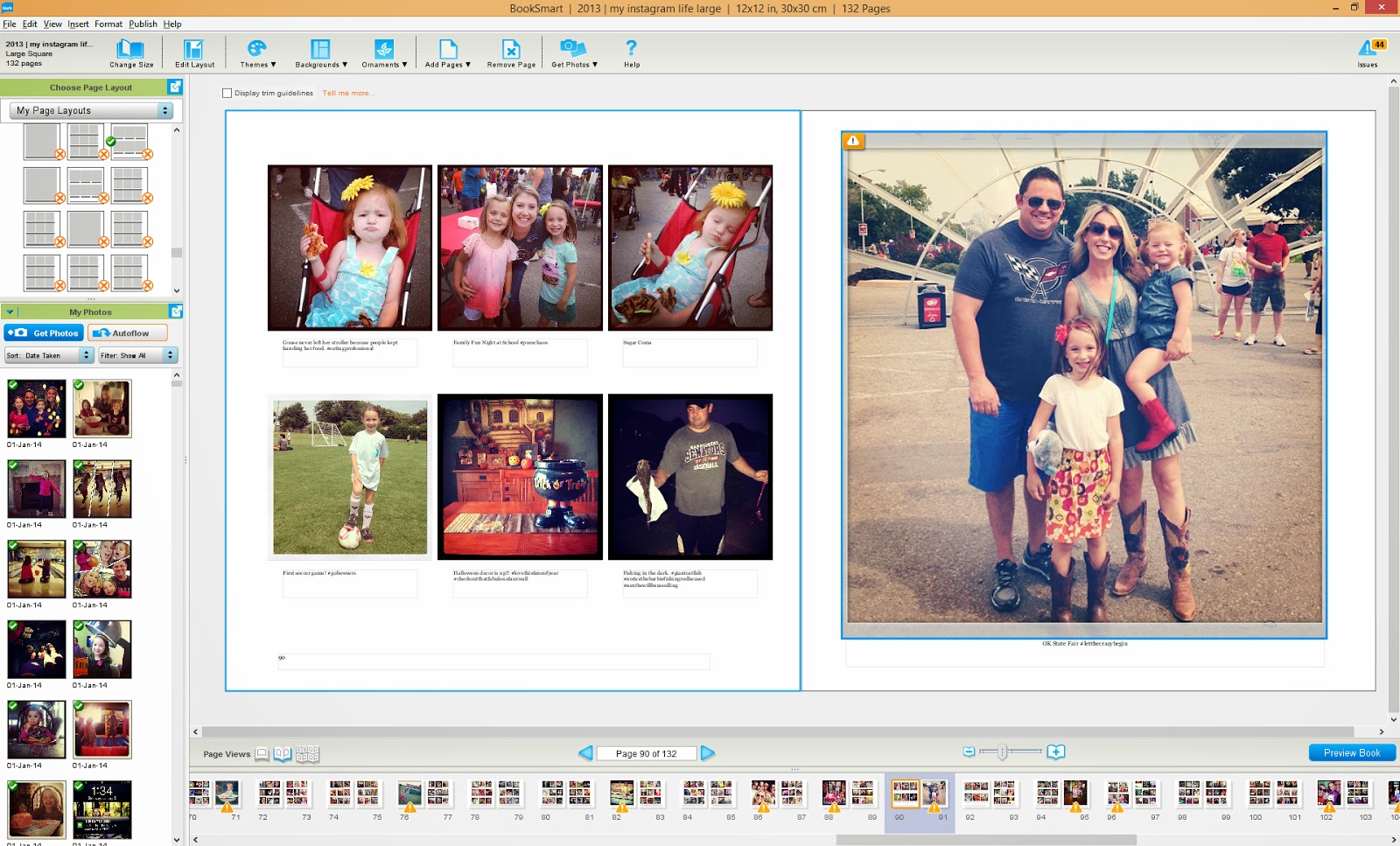 If you chose the "Yes, please organize my photos by Date Taken", your photos will already be filled in on each page. If you didn't, your photos will be under the "My Photos" section at the bottom left-hand side of your screen and your blank pages will be across the bottom.