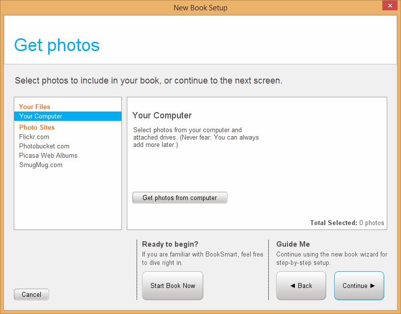 The next screen will ask you to "Get photos from computer"... just go to the folder you've saved them in and select all.