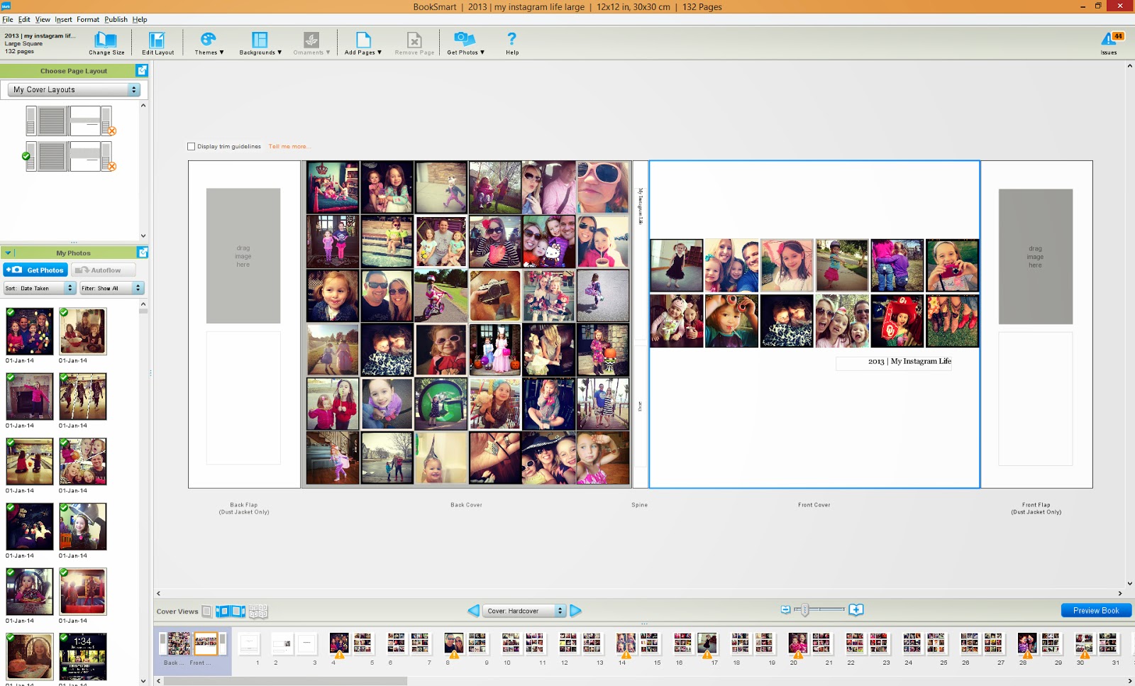 For the cover, I wanted something crisp and clean, so I created two simple rows of my favorite Instagram shots. For the back, I used the same row layout, but filled the entire page with photos.